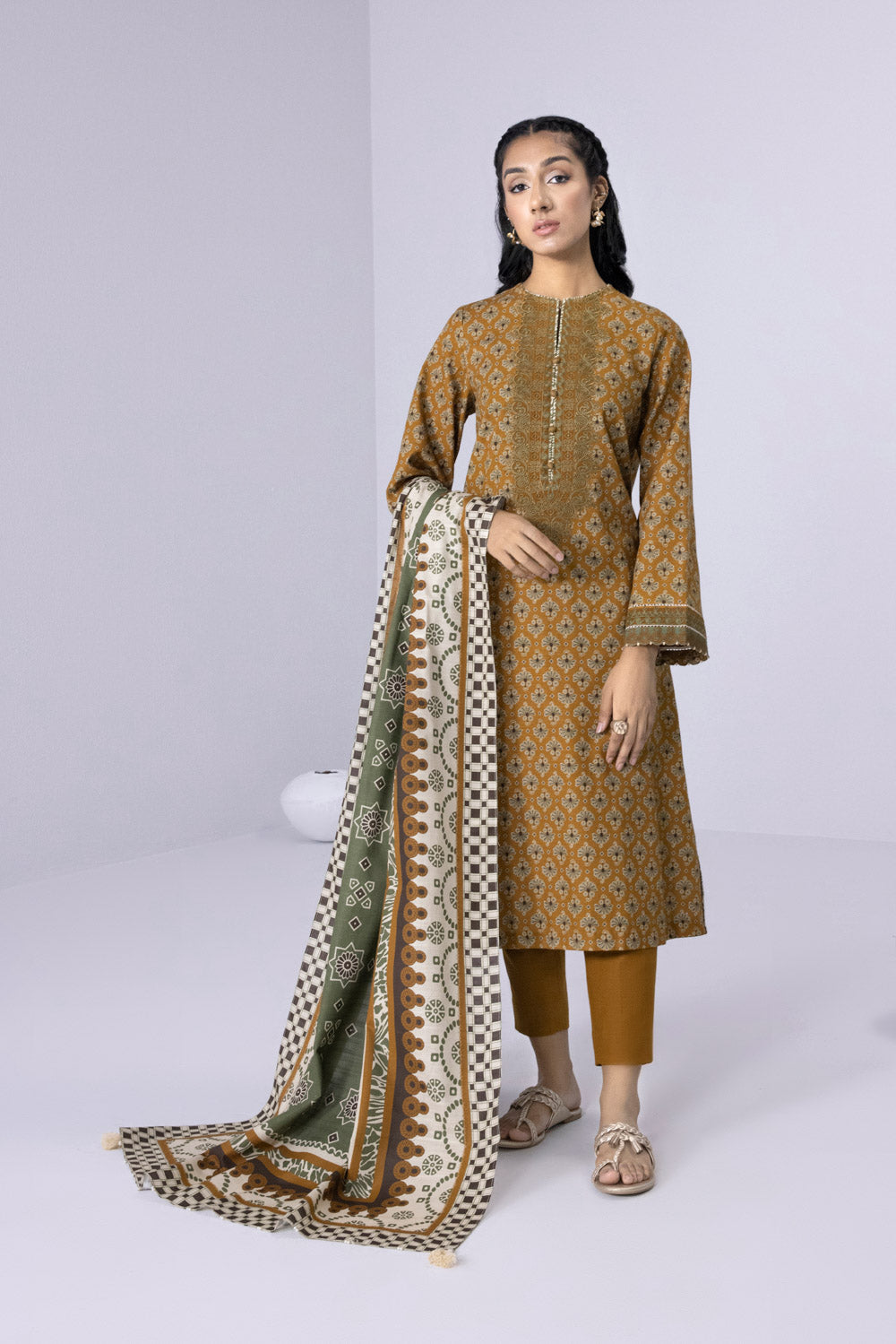 Look regal with this mustard hued embroidered khaddar ensemble featuring matching trouser.