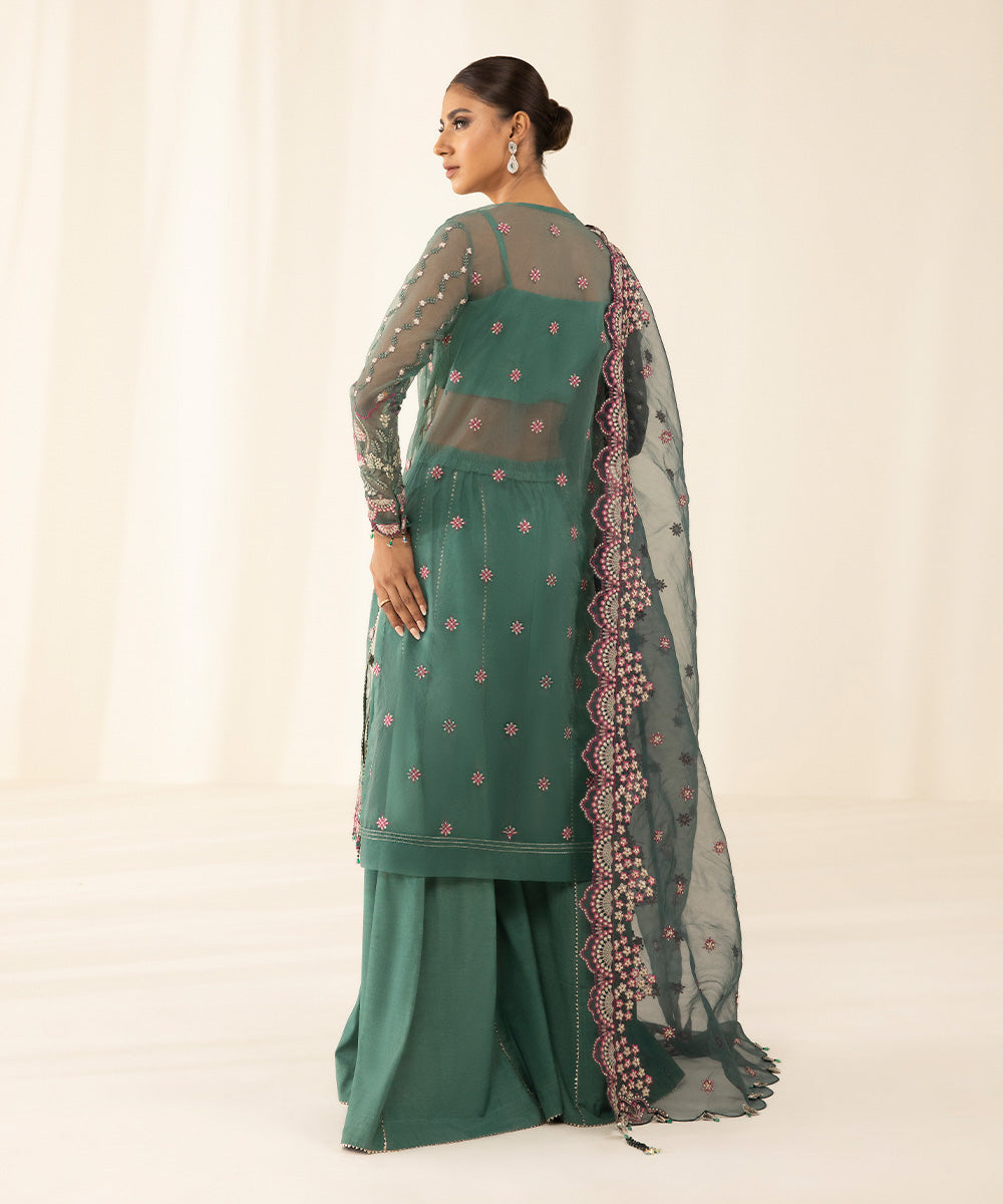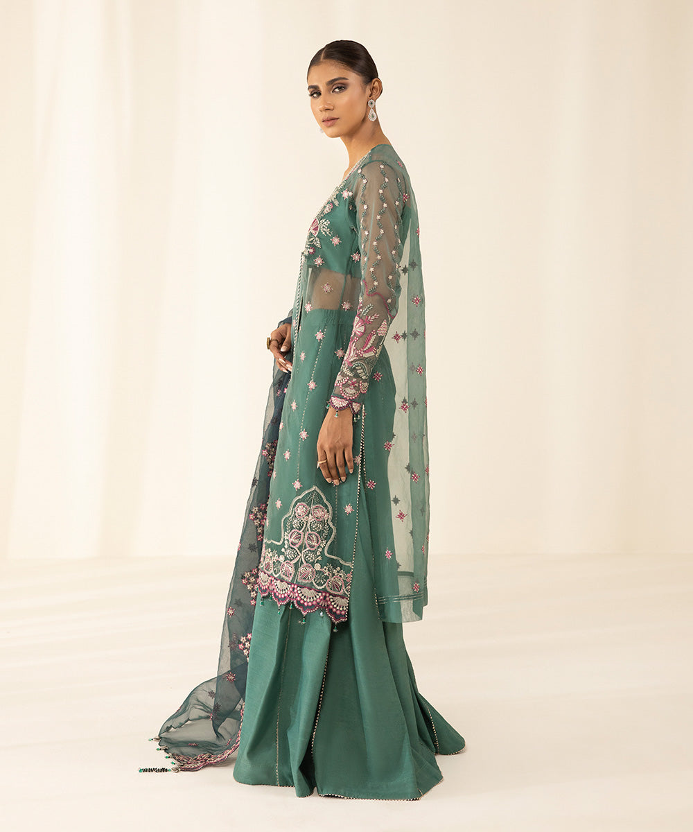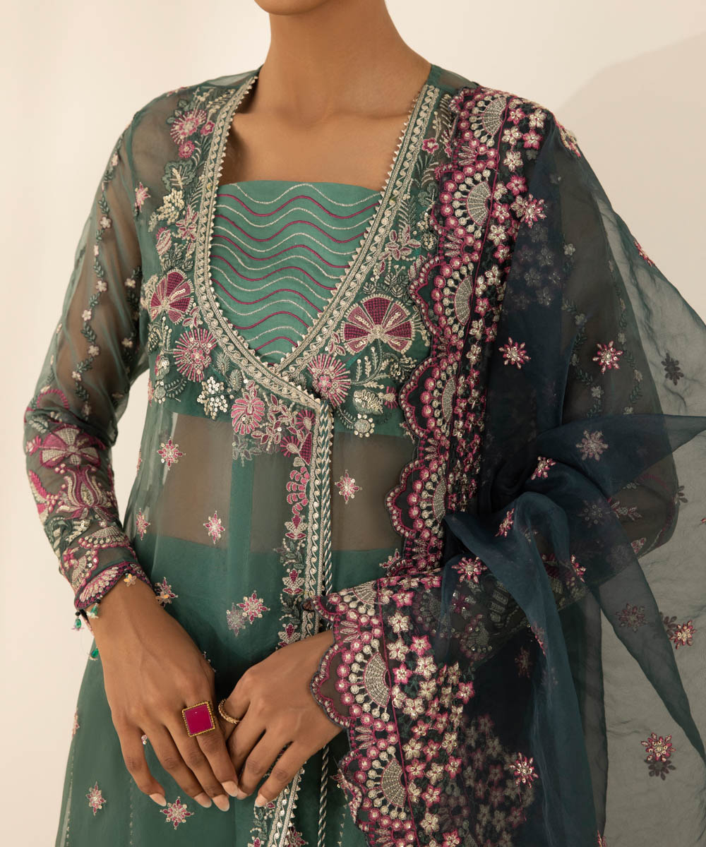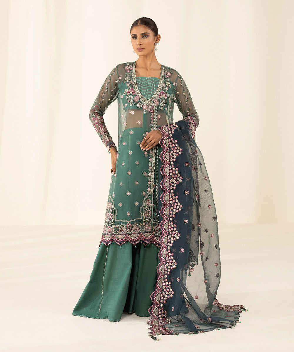 Dazzle away this festive season in our organza one-piece accented with intricate embroidery and sequin work
