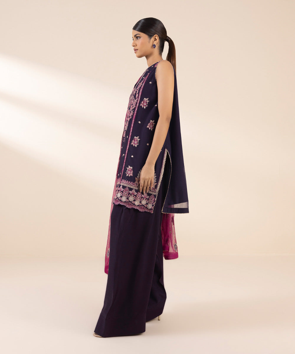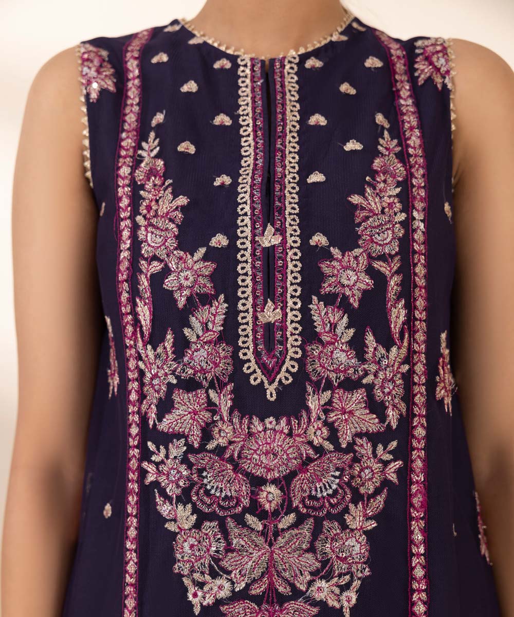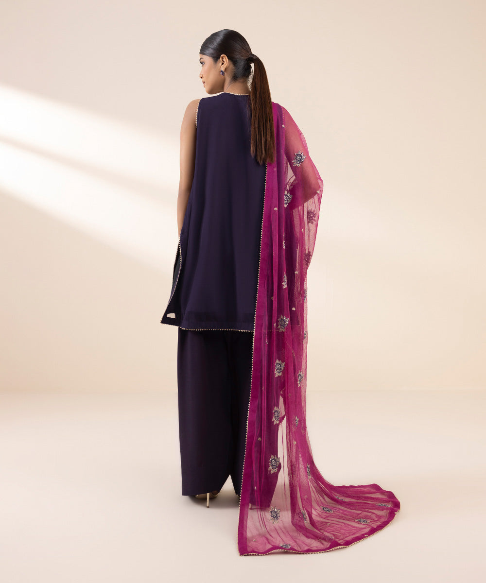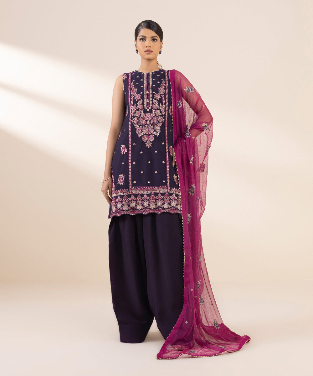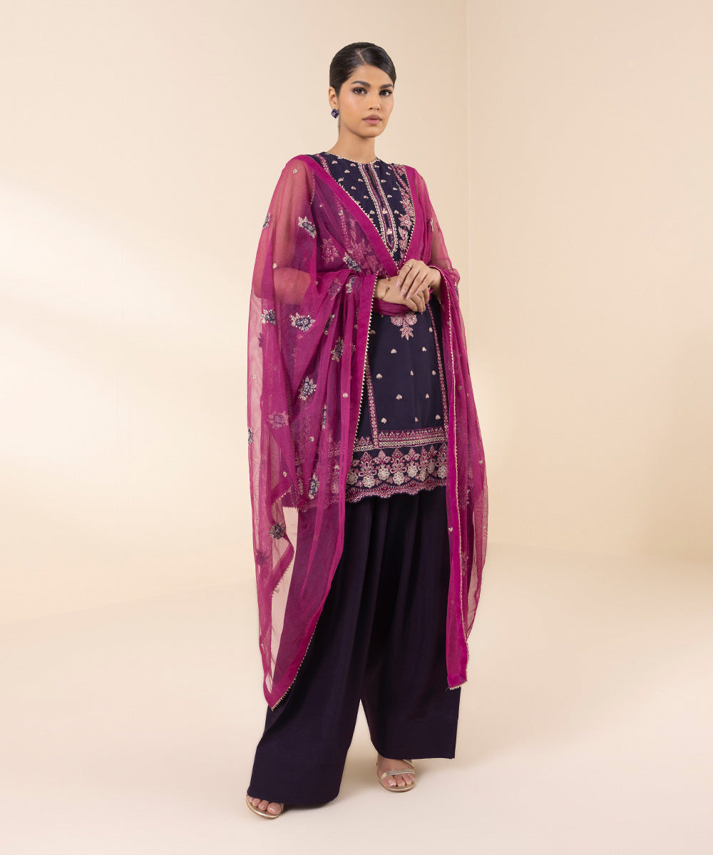 Make a statement with our two-piece ensemble in purple featuring a dyed embroidered blended net shirt and h a pink dupatta