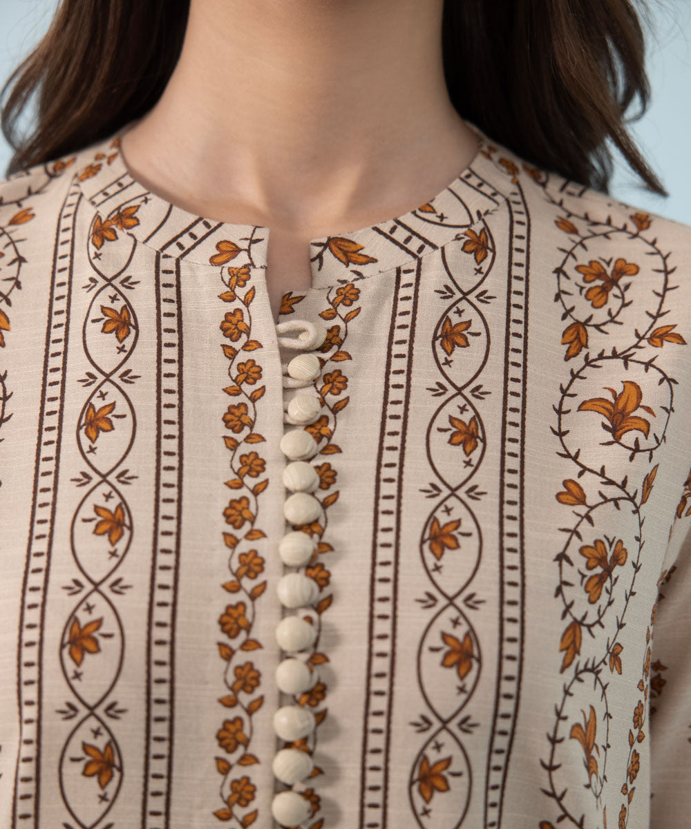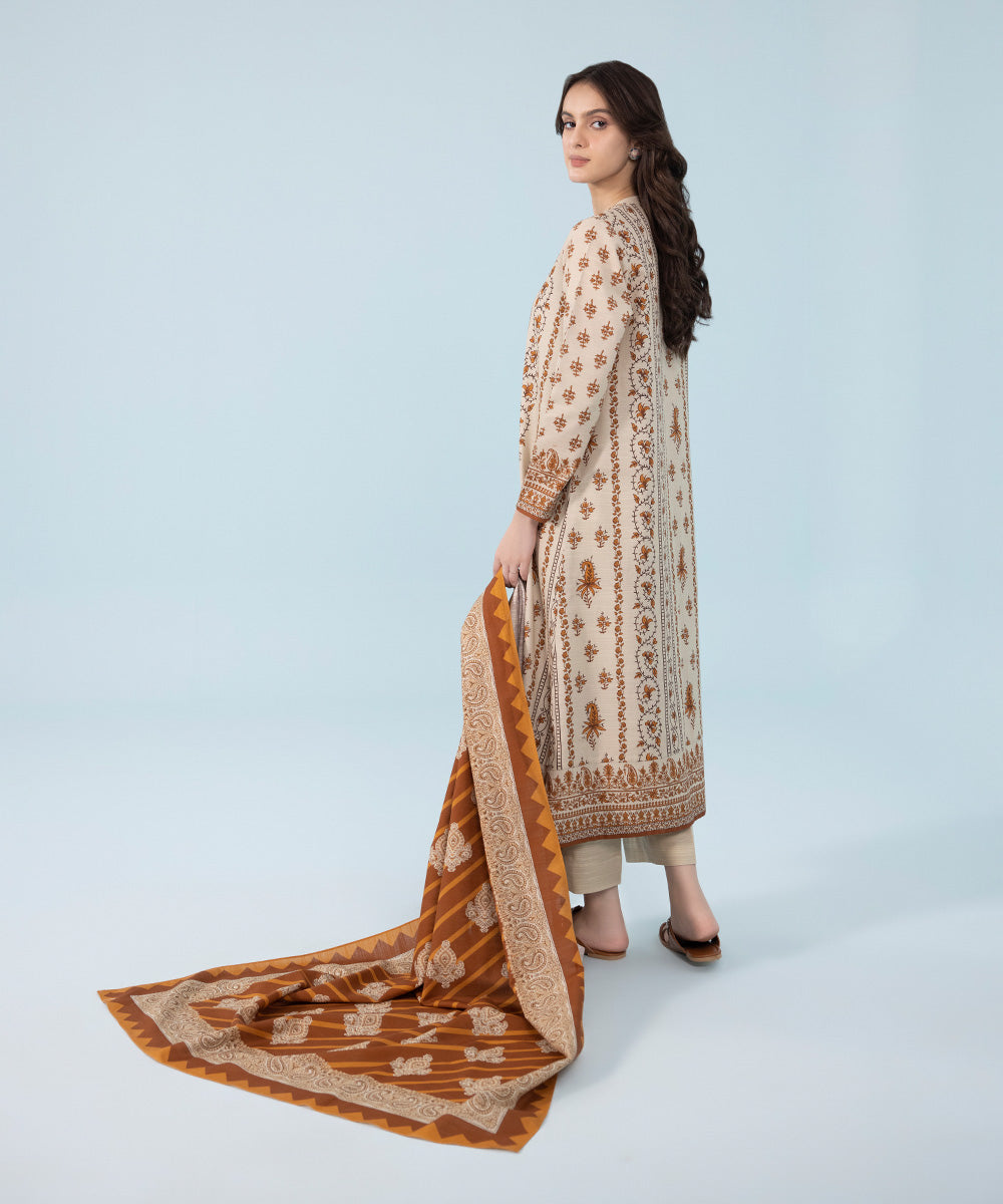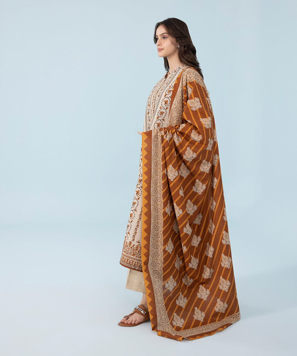 Uplift your style with our off white & rust ethnic patterned three-piece with lawn dupatta and cambric trousers