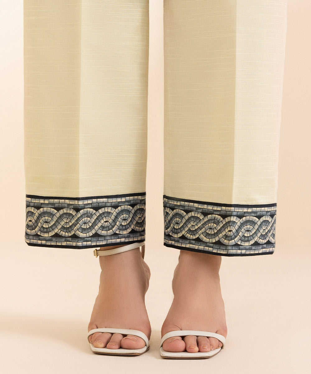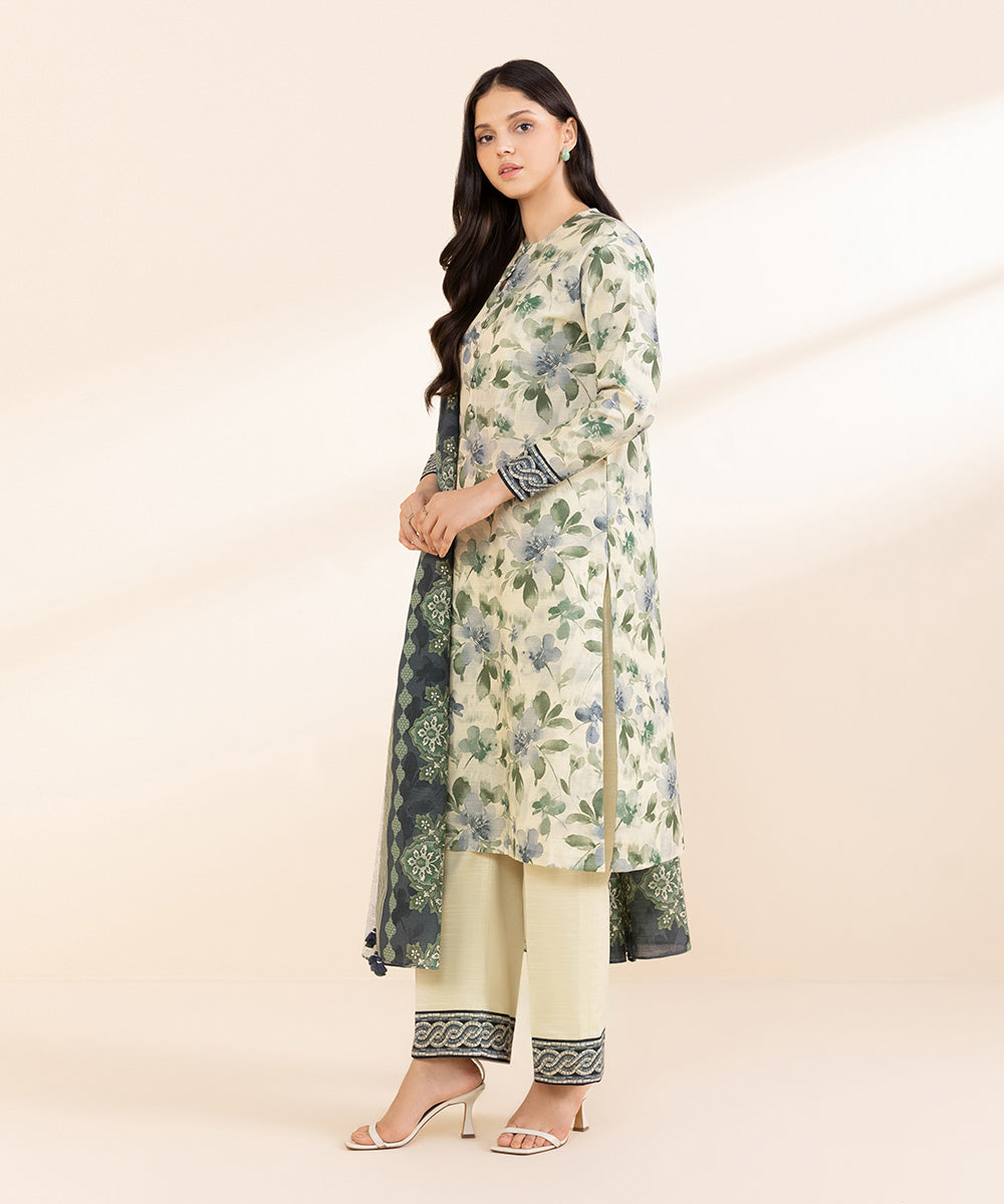 Experience classic floral prints in our ivory and blue three-piece featuring light khaddar shirt, trousers and dupatta.