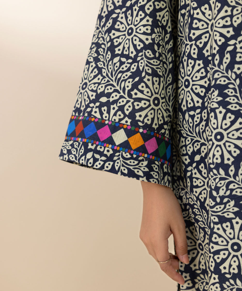 Elevate your style with our two-piece printed light khaddar ensemble in blue and off white
