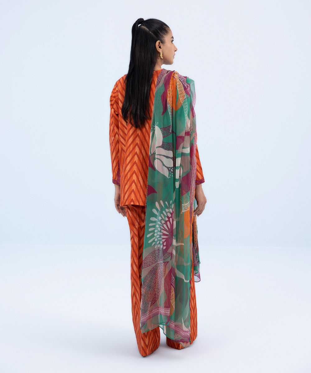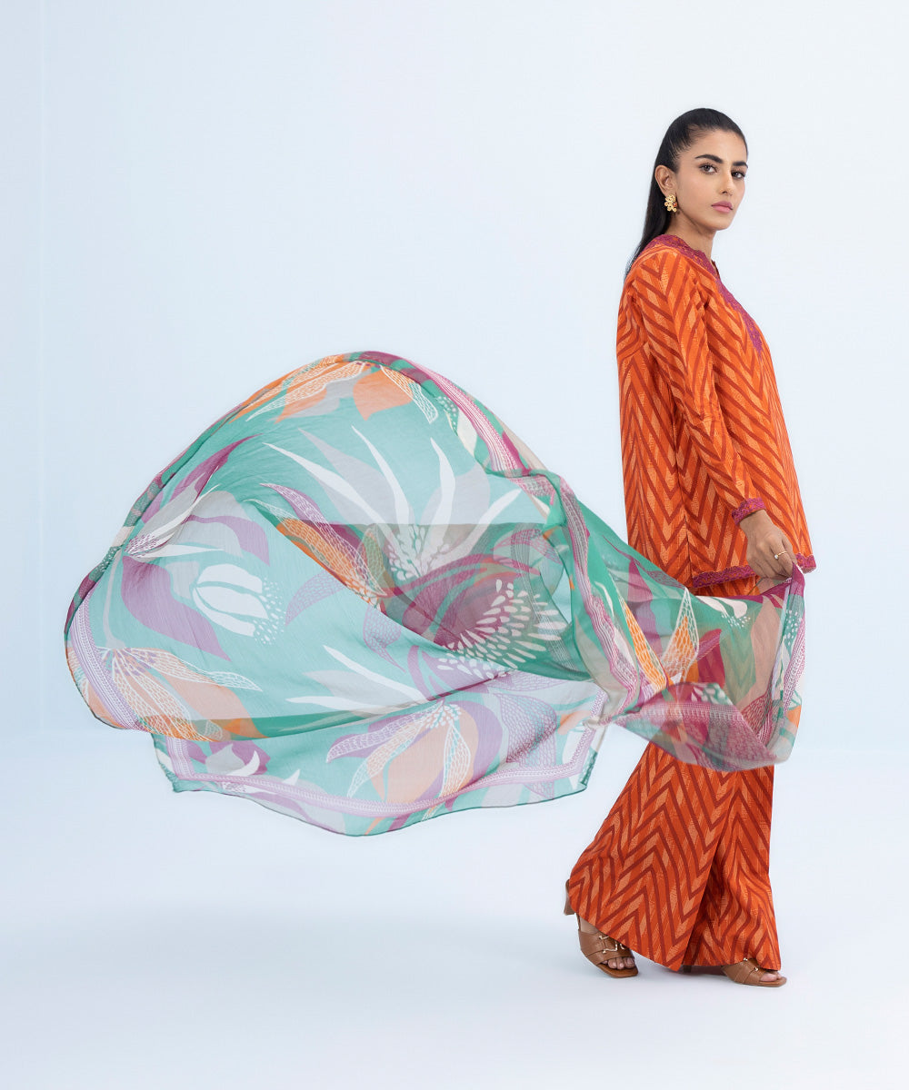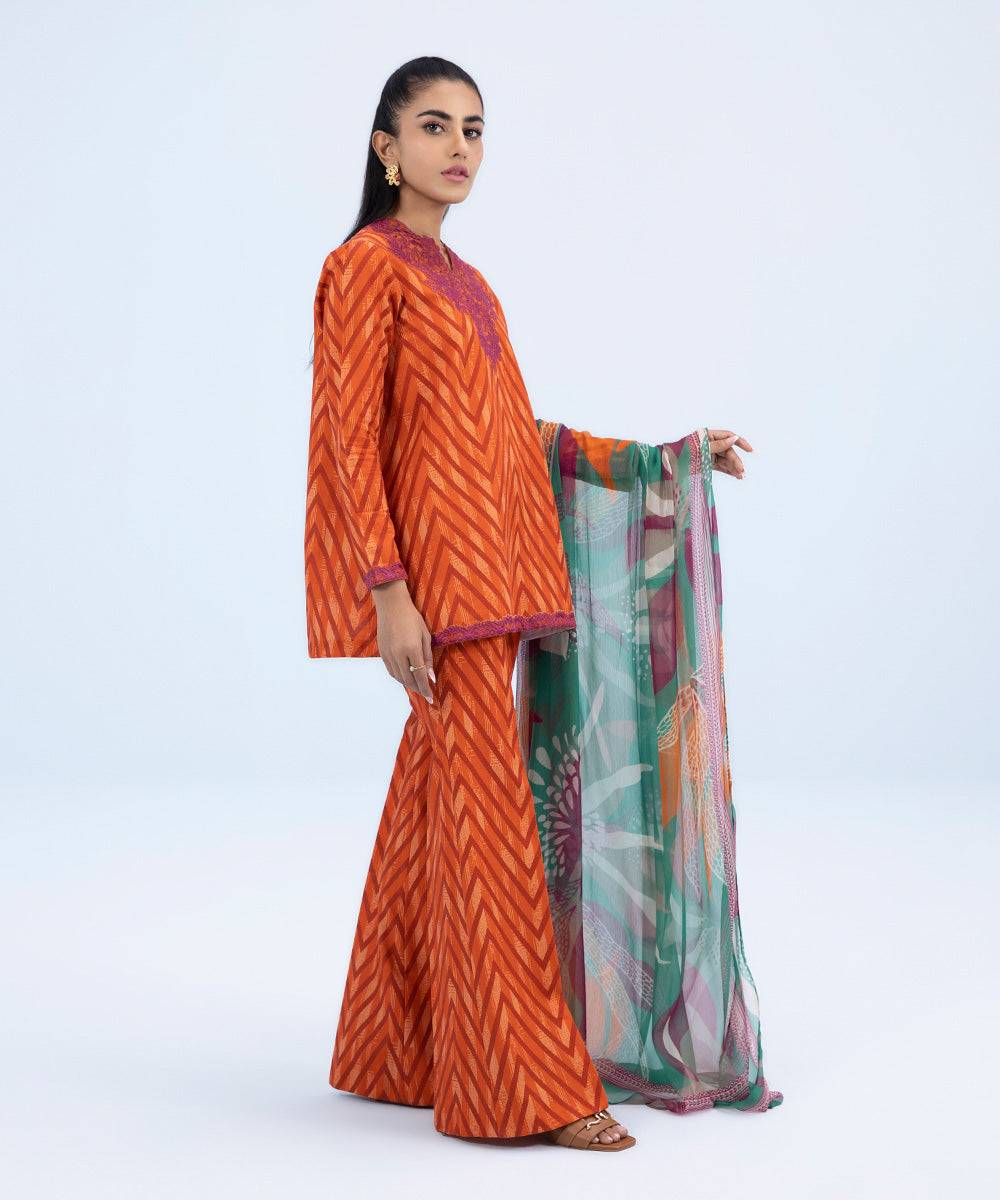 Make a statement in our orange one-piece featuring enticing patterns Unstitched 1-PieceShirt: Printed Khaddar Shirt 3MDyed Embroidered Blended Organza Neck 1PC Fabric: Khaddar Colour: Orange