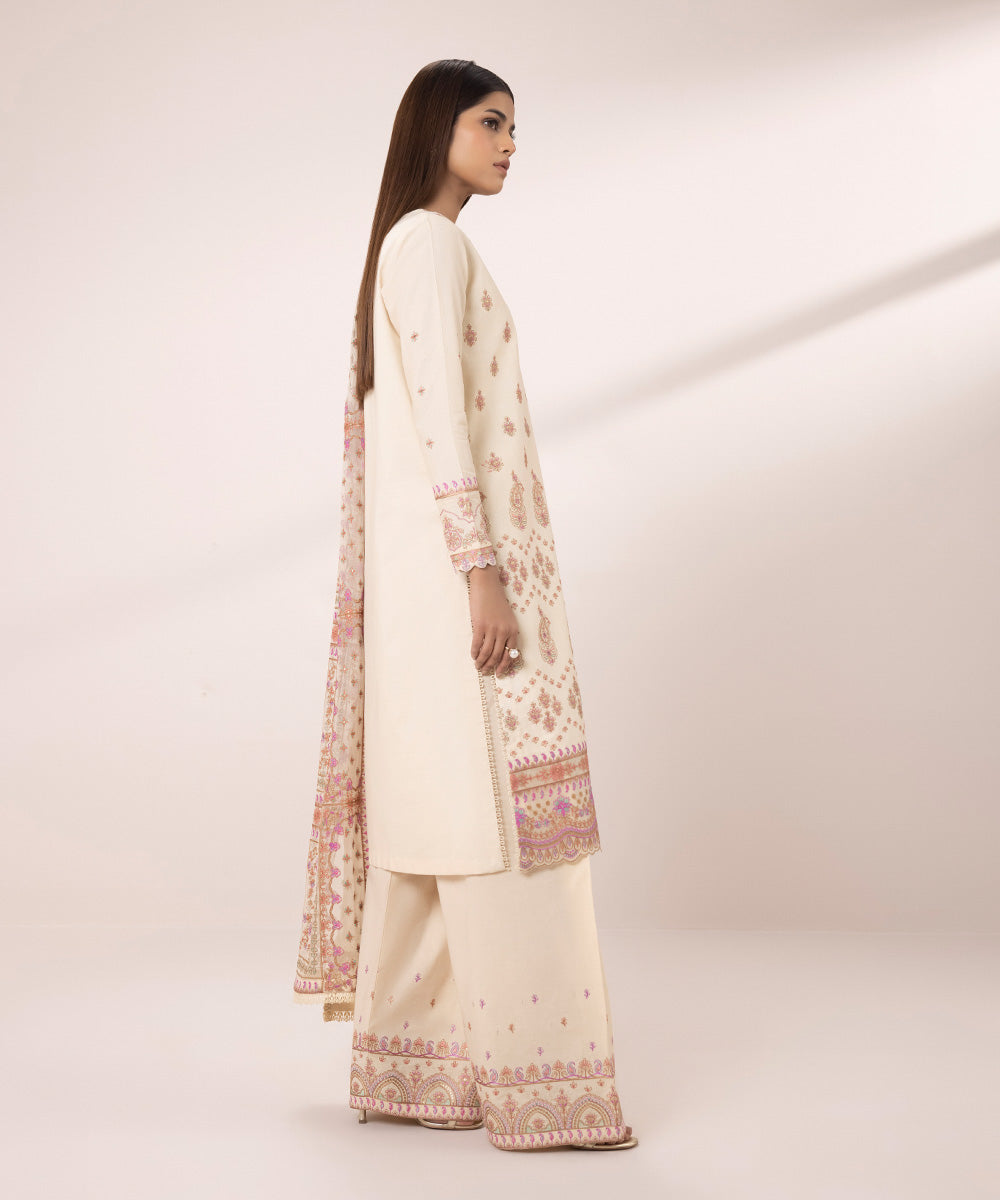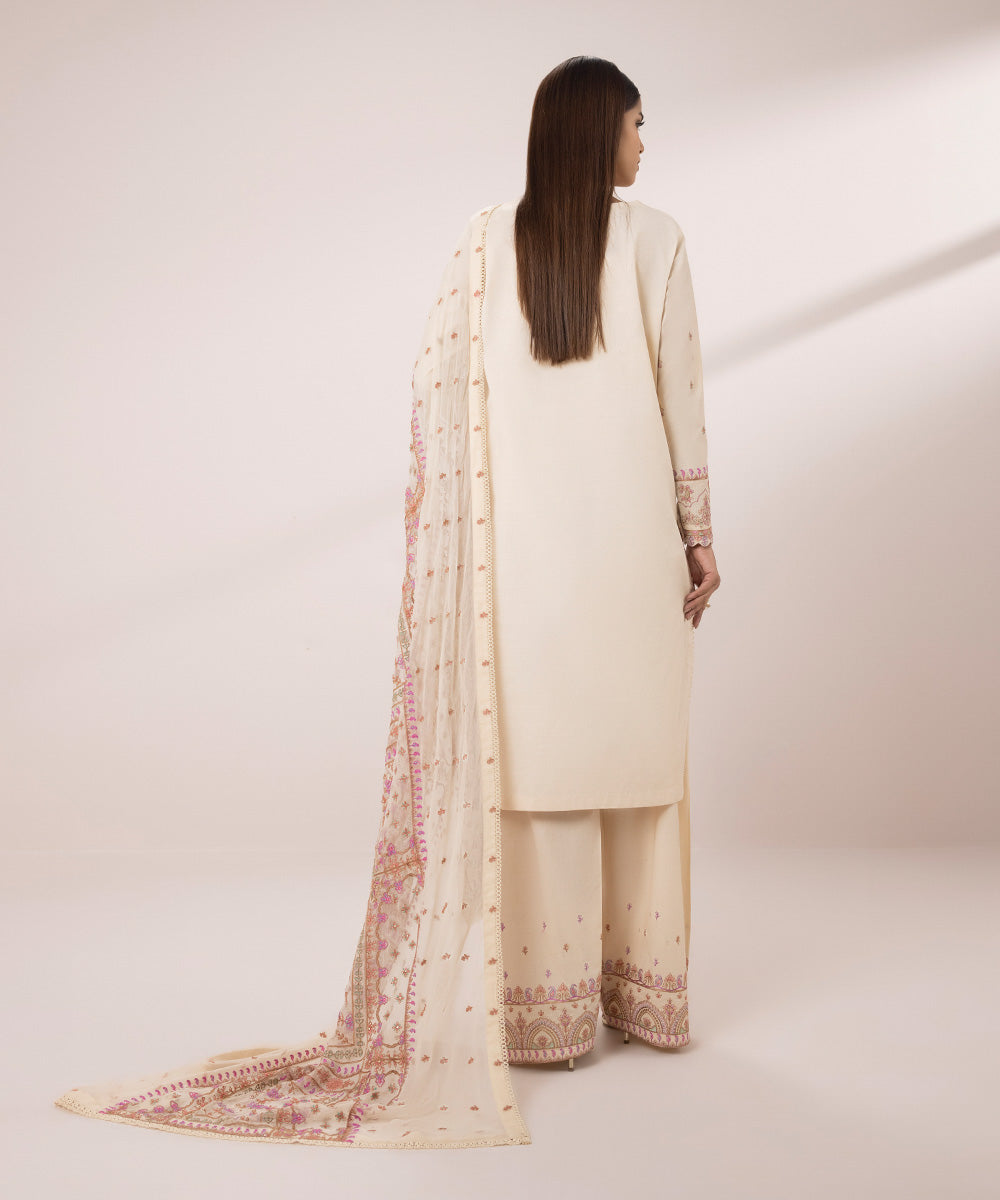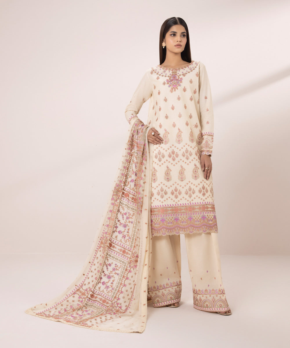 Make a standout statement with our ivory, three-piece embroidered suit featuring a multicoloured crinkle chiffon dupatta.