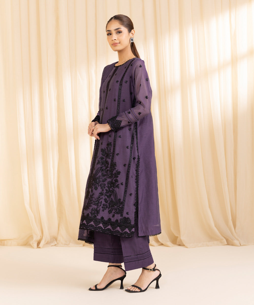 Elevate your style with our three-piece luxe ensemble in lilac featuring a blended muslin shirt and dupatta with raw silk trousers.