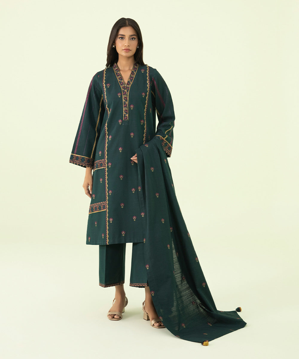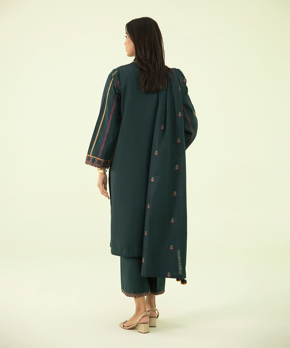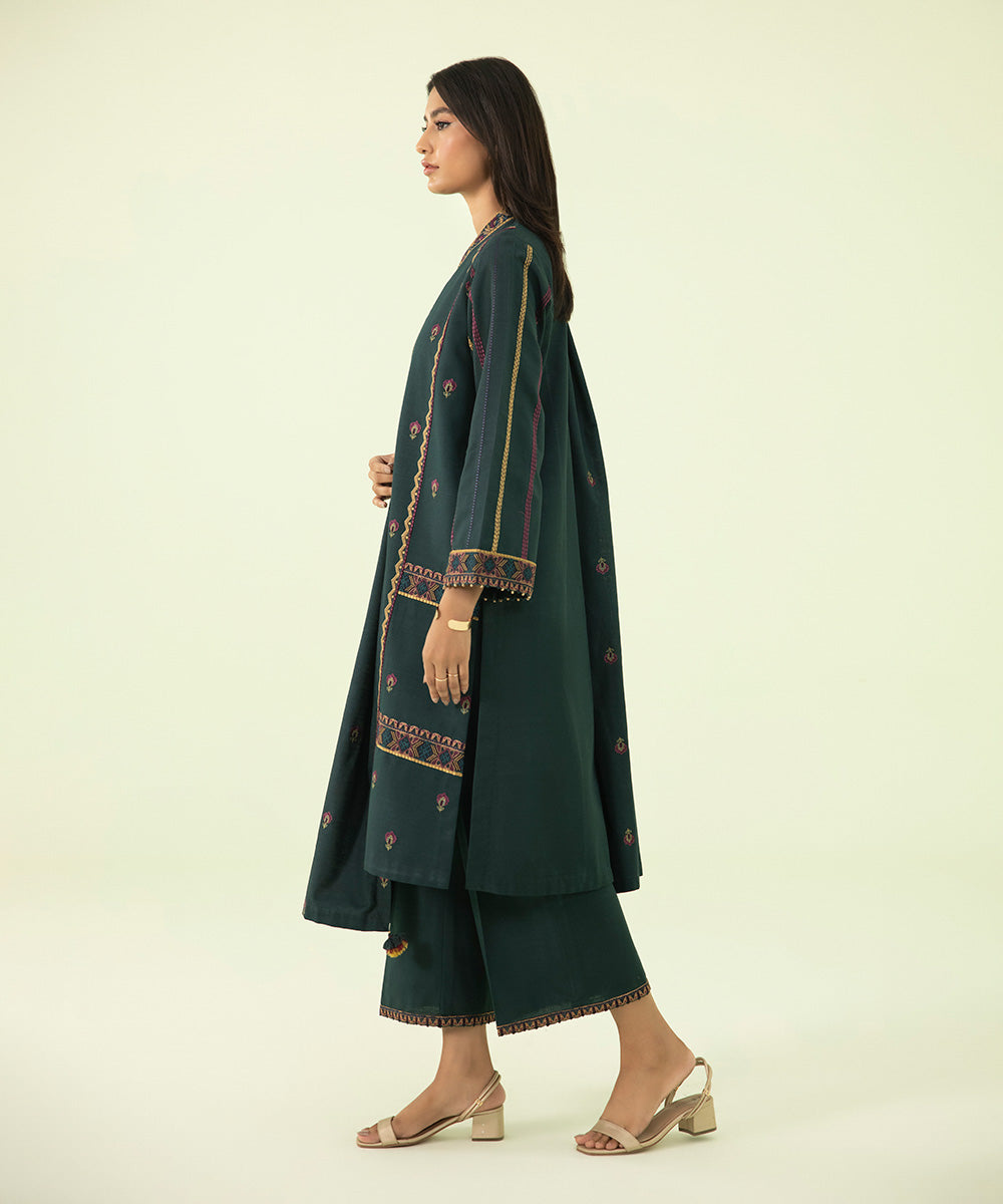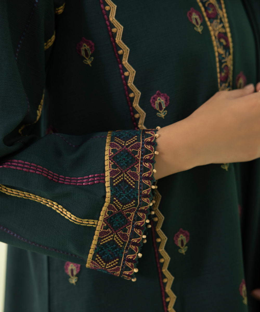 For a regal statement adorn our teal green one-piece ensemble with accentuated detailsUnstitched 1-PieceShirt: Dyed Embroidered Khaddar Shirt Fabric: Khaddar Colour: Teal Green